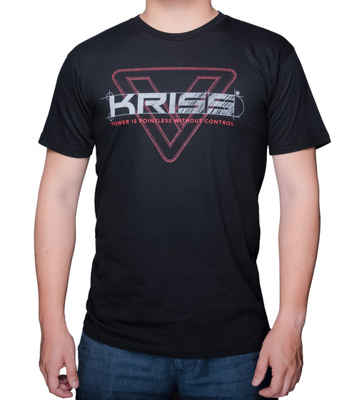 Black T-Shirt with KRISS word logo in white, in front of the Super V logo in red.